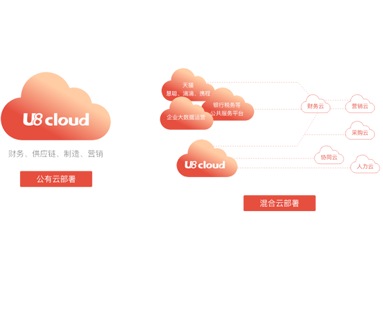 公有云部署:云应用和ERP业务均部署在公有云,这种模式使用成本较低,数据保护方面也比较有保证,且方便扩展云服务 混合云部署:云应用部署在云端,企业ERP部署在企业内部,相互独立,但在云的内部又相互连通,可以发挥出各自的优势